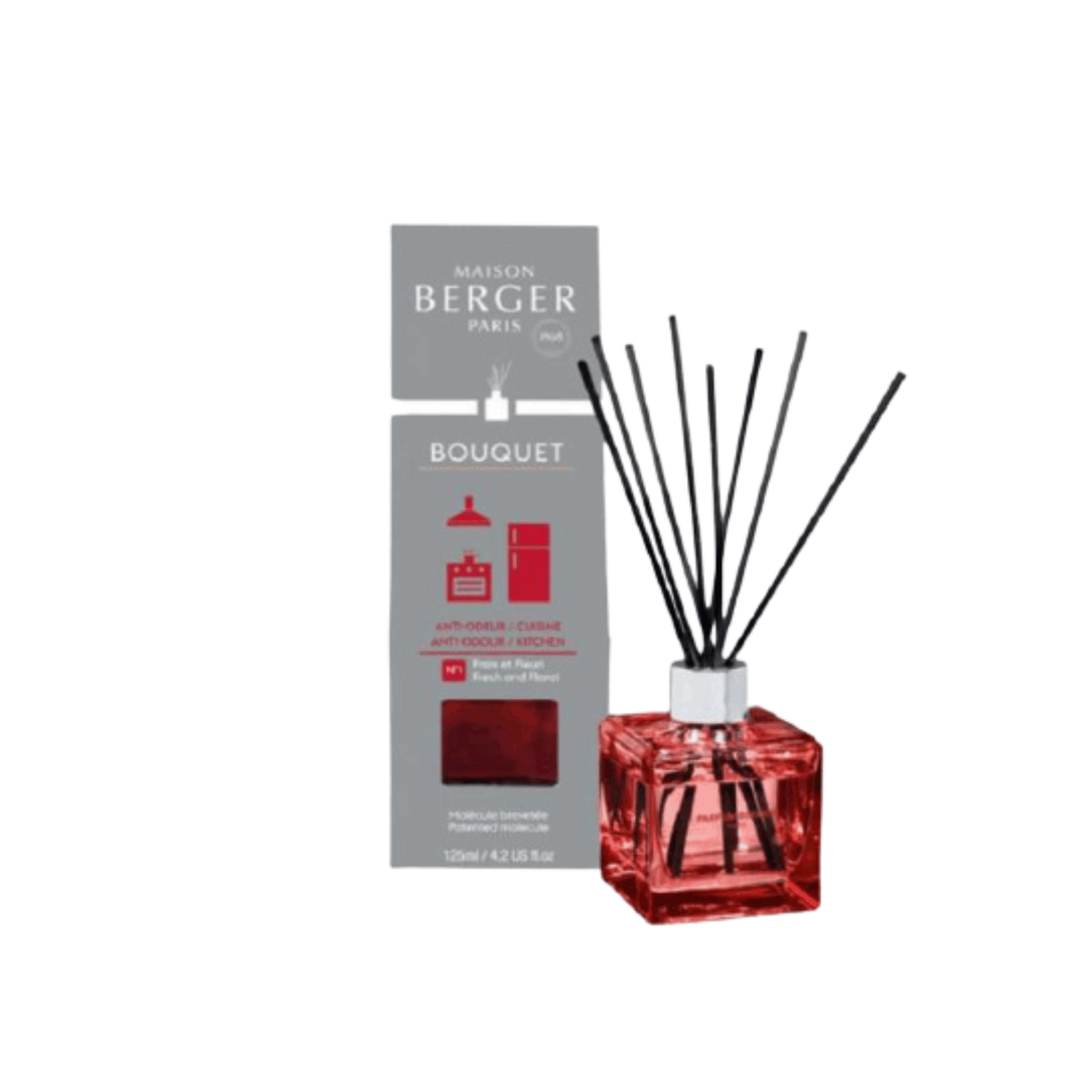 Elegante e contemporaneo questo cubo in vetro laccato rosso con la serigrafia del logo Parfum Berger darà un tocco dinamico alla cucina.