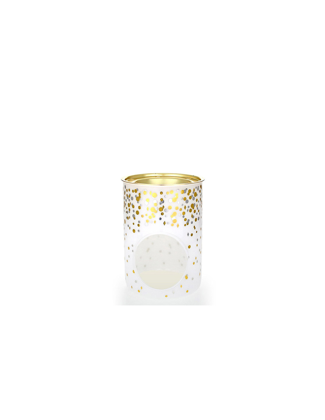Bruciatore in vetro bianco con disegni di lustrini dorati e argentati. La parte di alloggio destinato alla cera da fondere è in metallo dorato. Un accessorio perfetto per illuminare le tue feste. La forma cilindrica, inoltre, lo rende adatto a diventare un complemento di arredo che sarò ben adattarsi al tuo ambiente preferito.