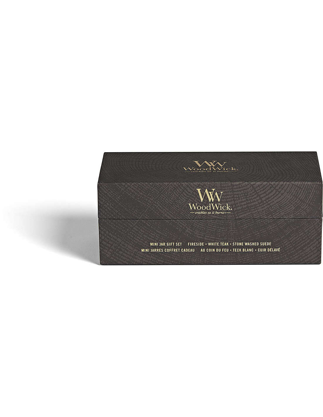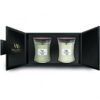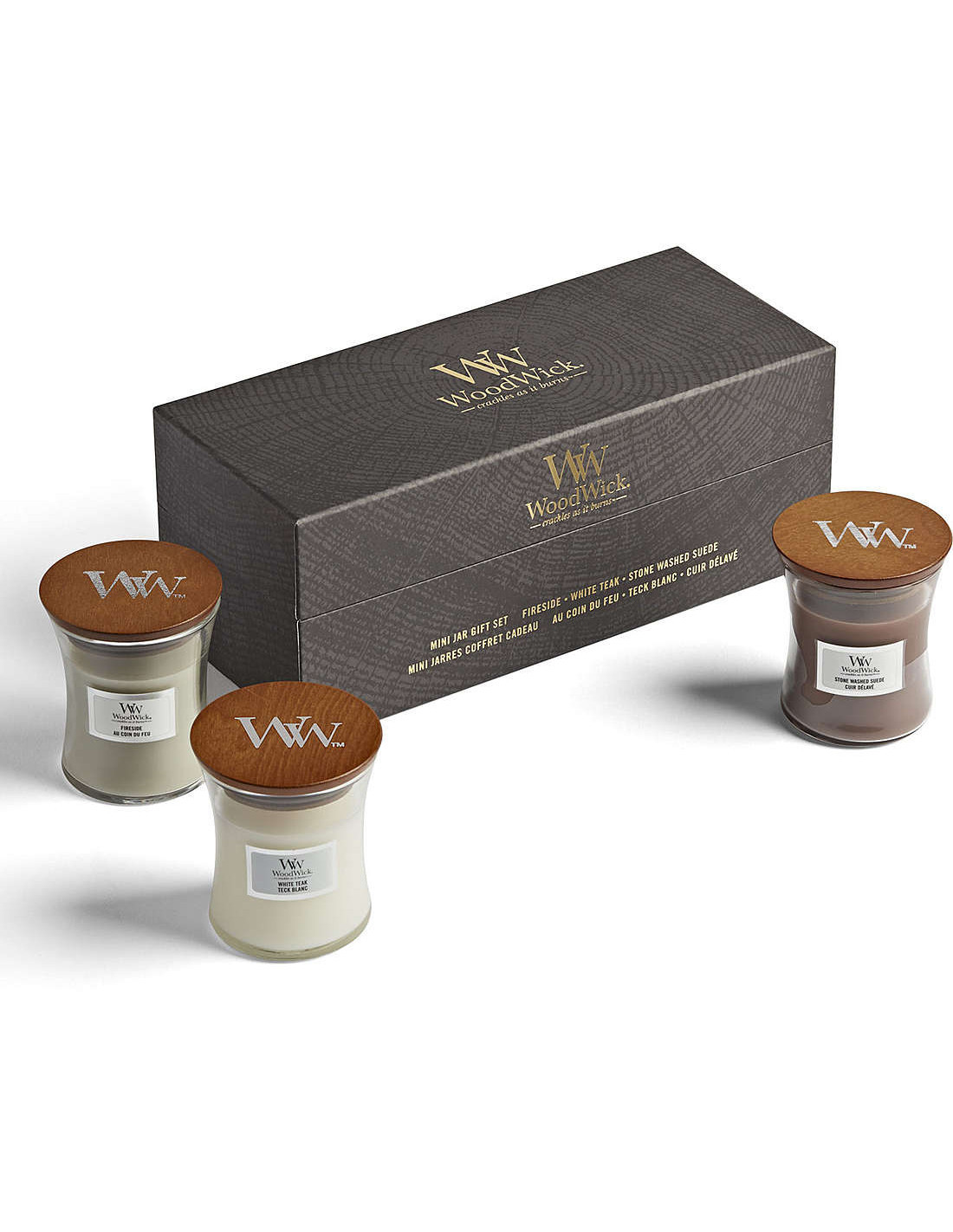 Prezioso scrigno con tre candele WoodWick formato Clessidra con fragranze eleganti e terrose.