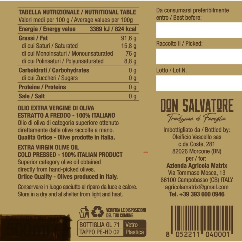 Il Don Salvatore è l’espressione autentica della tradizione olearia italiana firmata Azienda Agricola Matrix.