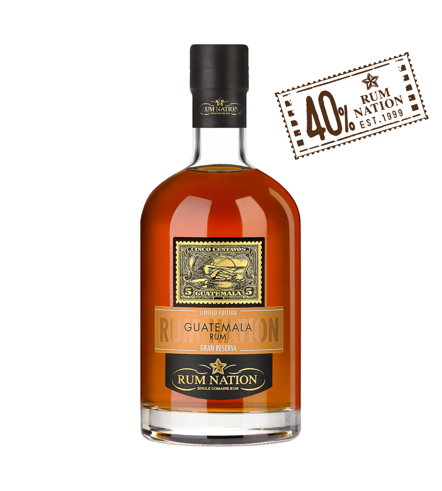 Il Guatemala Gran Reserva è uno dei rum più delicati della linea Rum Nation, prodotto da melassa di canna da zucchero e affinato in botti di rovere bianco ex-bourbon, nelle quali subisce una maturazione a 185 metri sul livello del mare per almeno 4 anni. Il risultato è un rum in pieno stile latino, dolce, con note di vaniglia e uva passa.