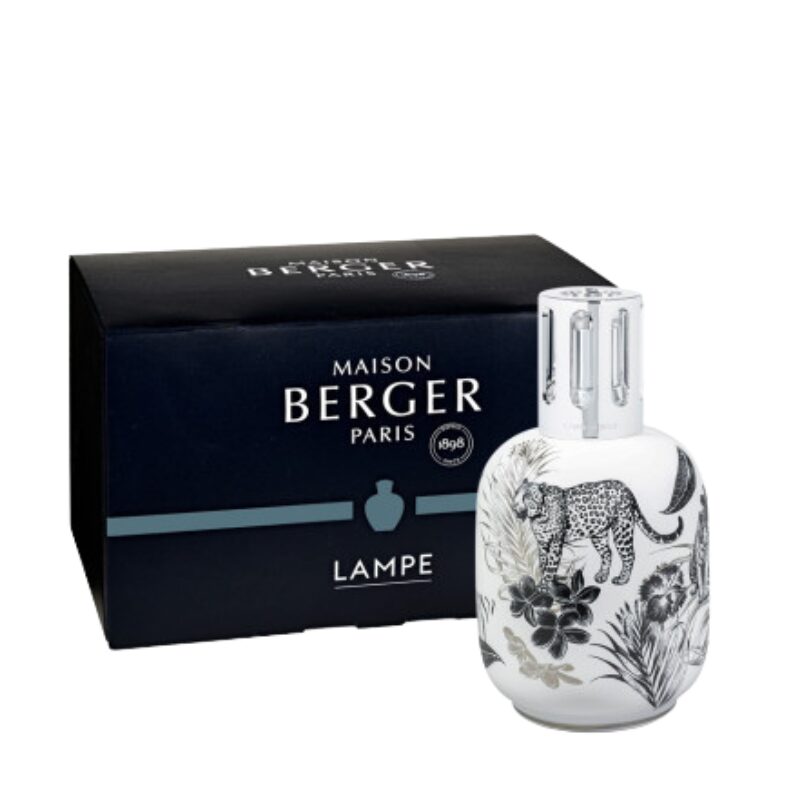 Lampe Berger Jungle (porcellana), bruciatore AIR PUR SYSTEM 3C, tappo, diffusore, imbuto, istruzioni. Confezione Lampe Berger in cartoncino blu. (Ricarica non inclusa.)
