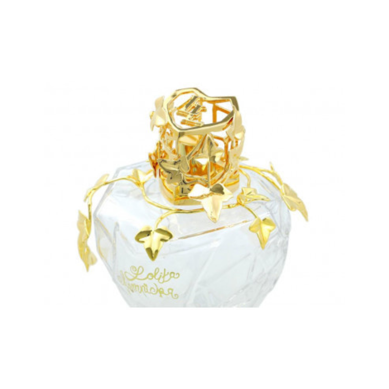 Si sposa bene con il cristallo la lavorazione in ottone del tappo, dalla classica forma a cuore con incise le iniziali LL (Lolita Lempicka), con decorazioni di foglie di edera che sono riprese anche dalla cornice, sempre in ottone, che abbracciano il collo della lampada.
