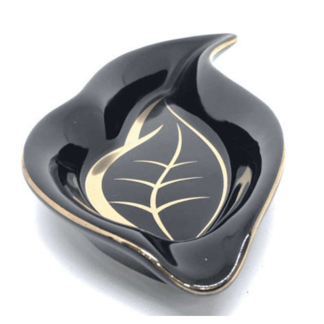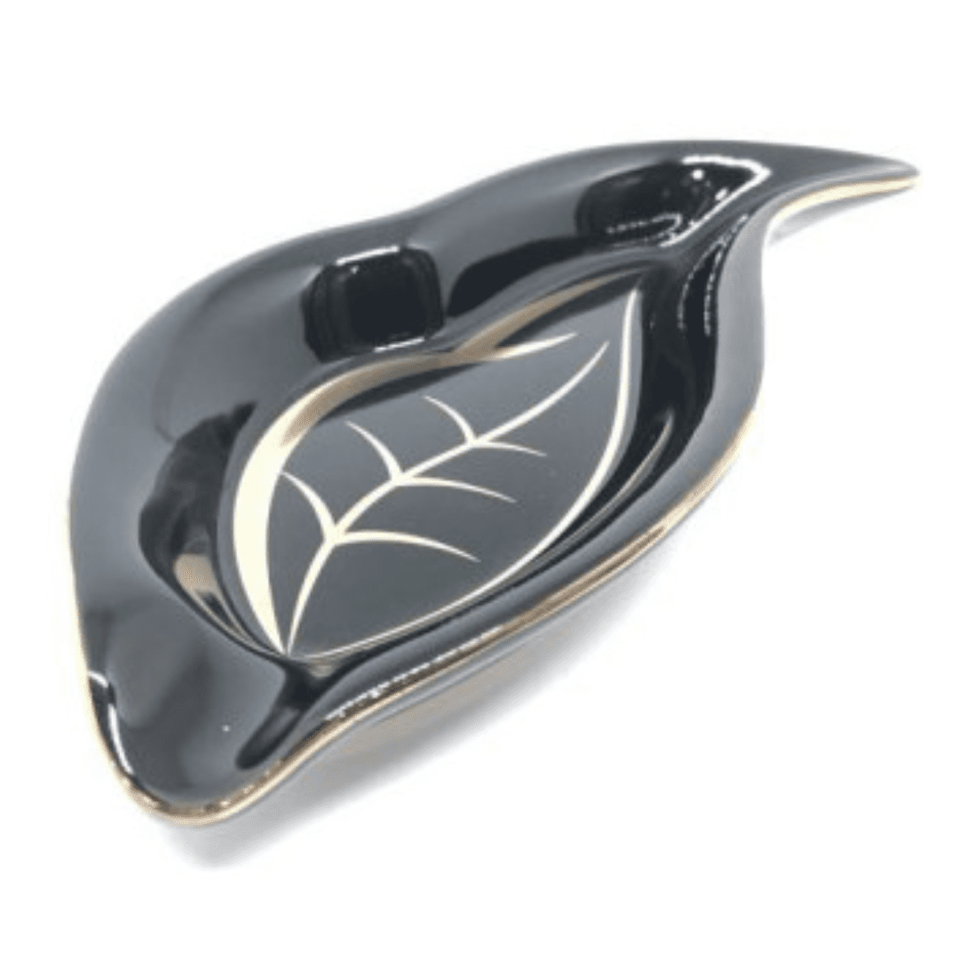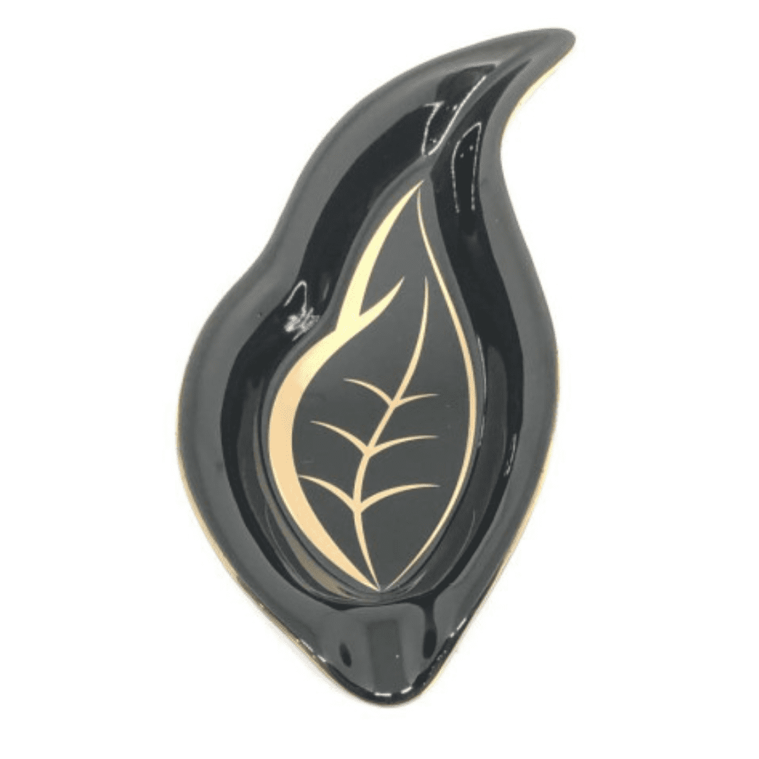 In ceramica nera lucida, disegnato per somigliare ad una grande foglia di tabacco, il posacenere con il logo dell’Habanos Festival e profilo dorato può ospitare un sigaro.