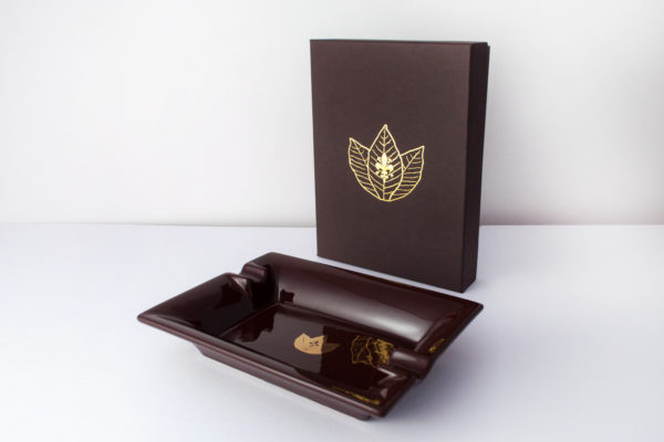 Elegante posacenere da tavolo per sigari realizzato in ceramica smaltata marrone. Posacenere rettangolare con logo centrale Manifatture Sigaro Toscano in oro, provvisto di 2 ampi incavi per appoggiare i sigari. Accessorio indispensabile per gli amanti del mondo dei sigari.