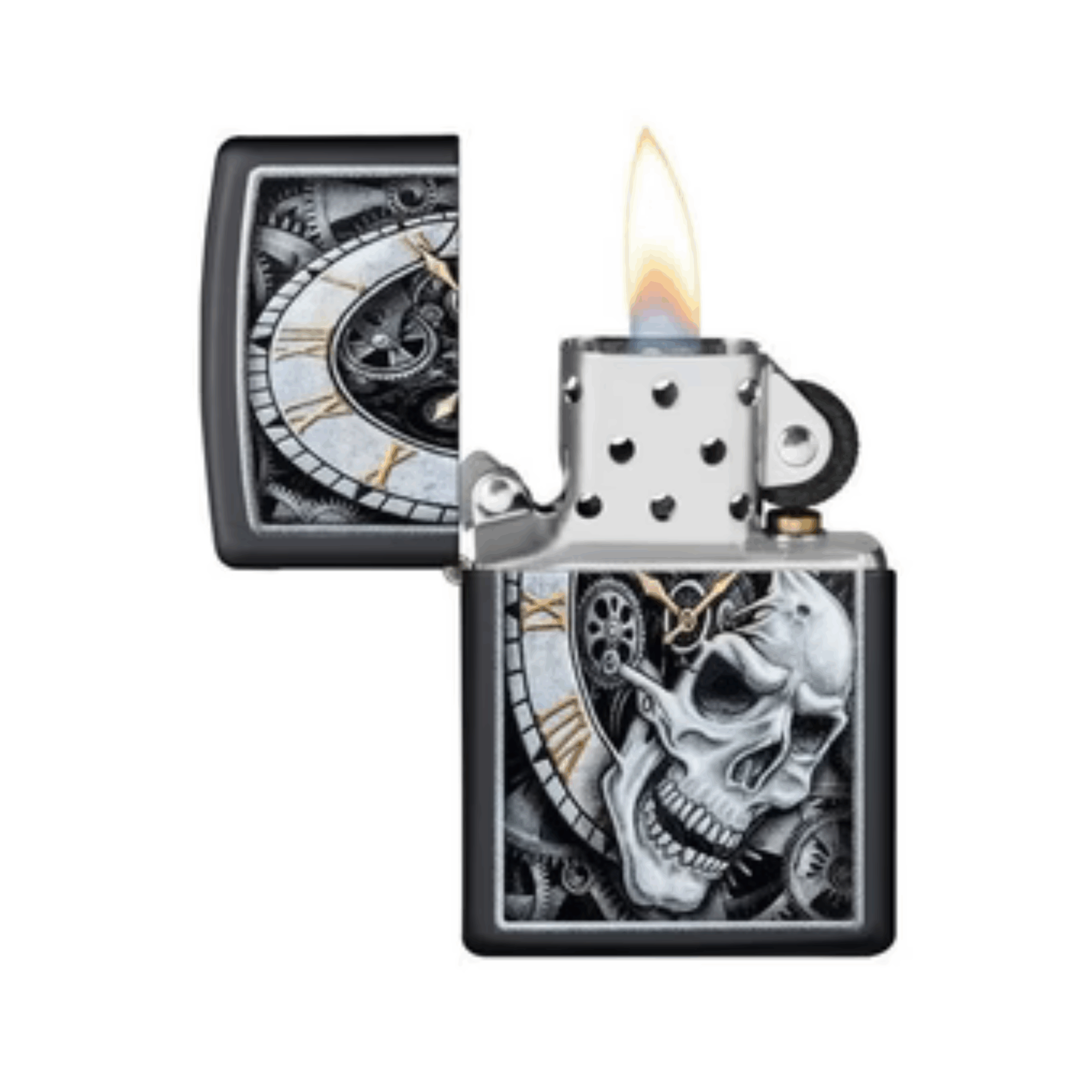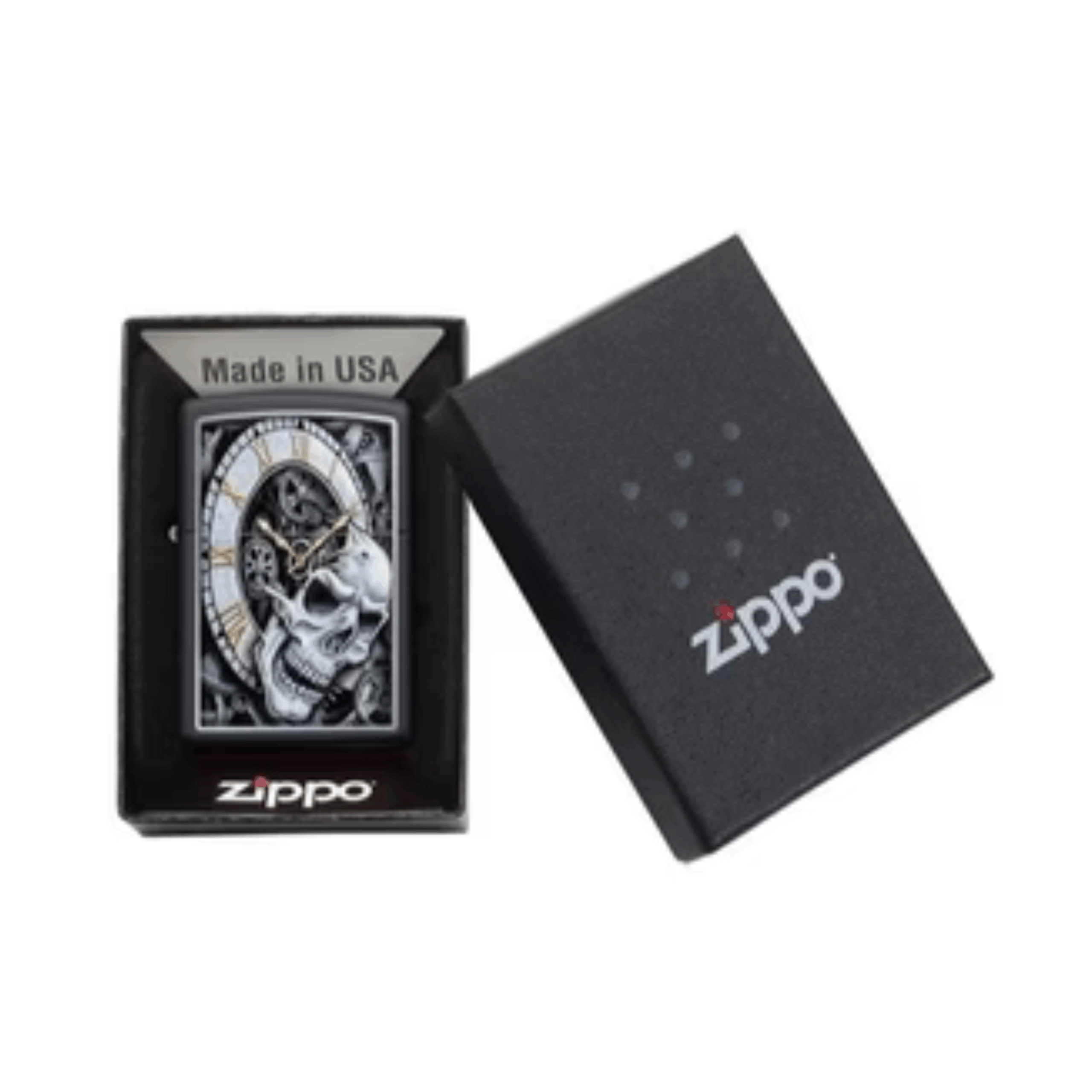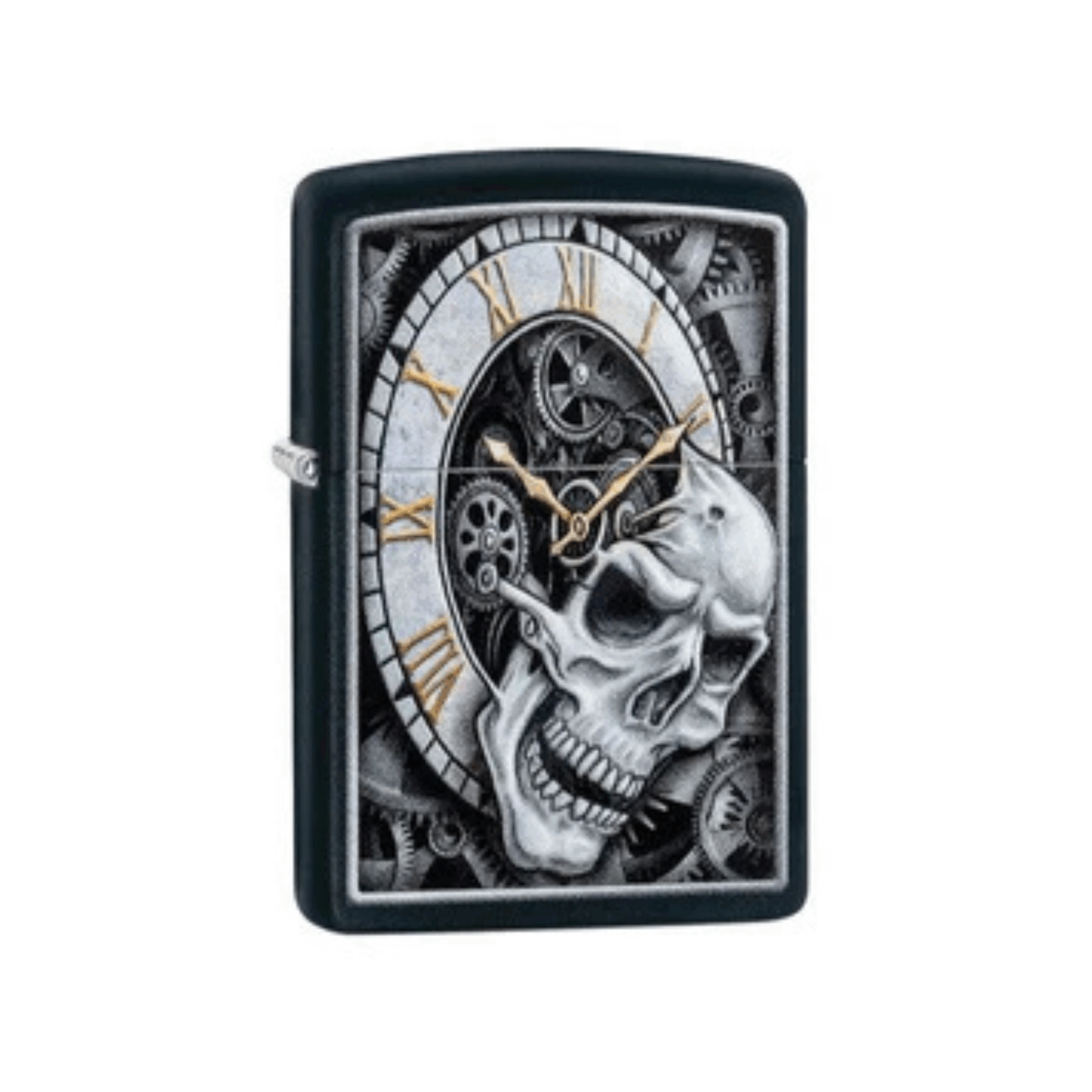 Consegna GratuitaZippo Skull Clock – Black Matte. Accendino antivento con artwork originale “Skull Clock” (penna & inchiostro, imaging a colori Zippo). Ricaricabile, corpo in metallo, “click” iconico. Made in USA. Gift box.
