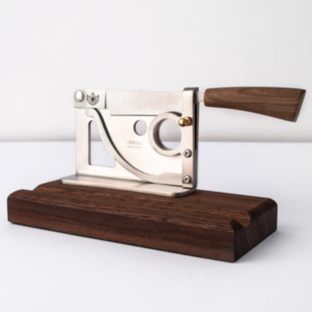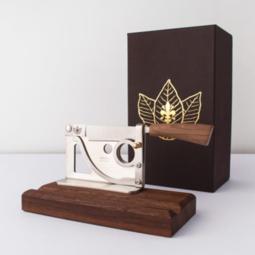 Porta a casa un oggetto di pregio pensato per appassionati e collezionisti. Questo tagliasigari a ghigliottina da tavolo unisce design italiano e funzionalità: base e manico in legno di noce per una presa solida, profilo elegante che arreda, e lama in acciaio per un taglio pulito, simmetrico e senza sfilacciature.