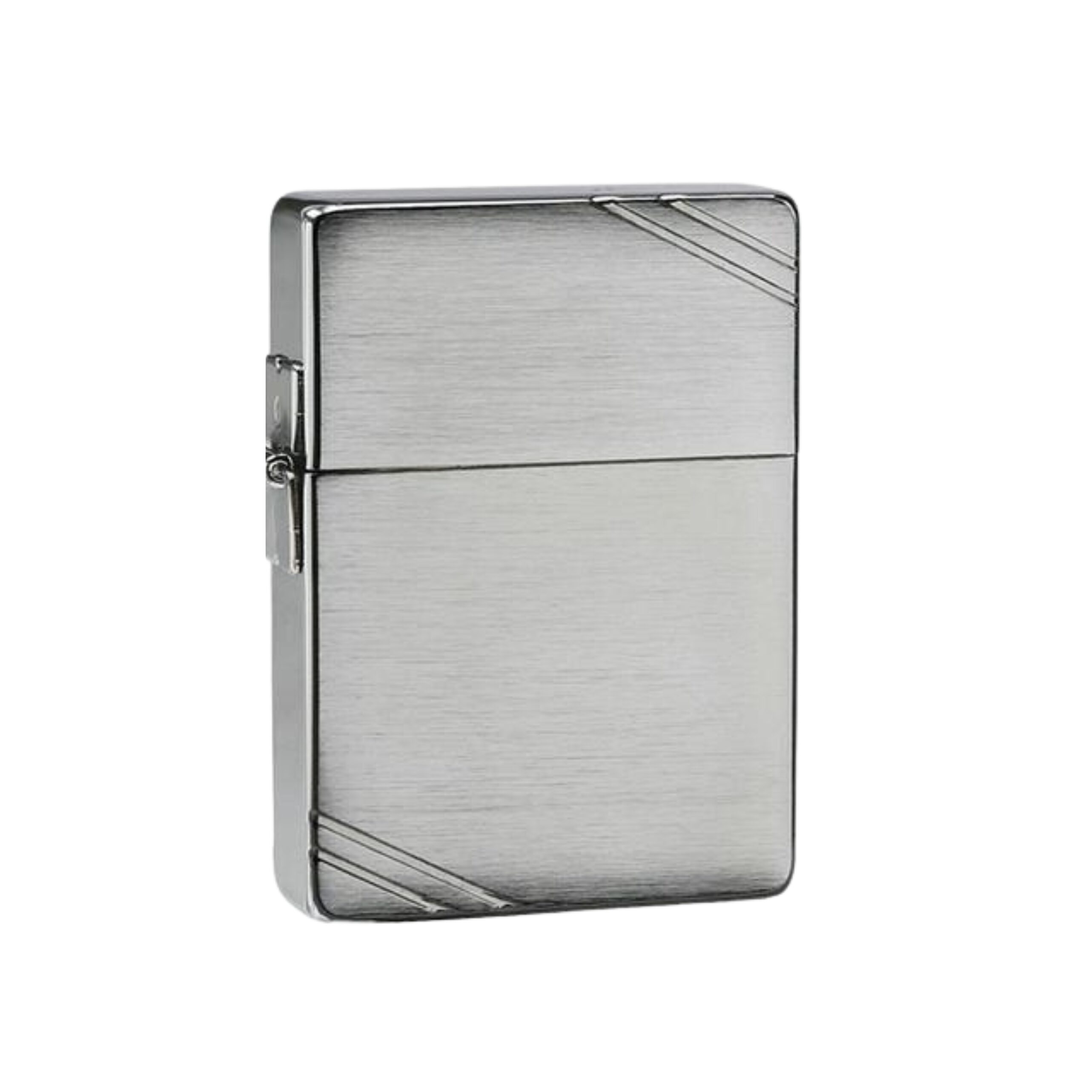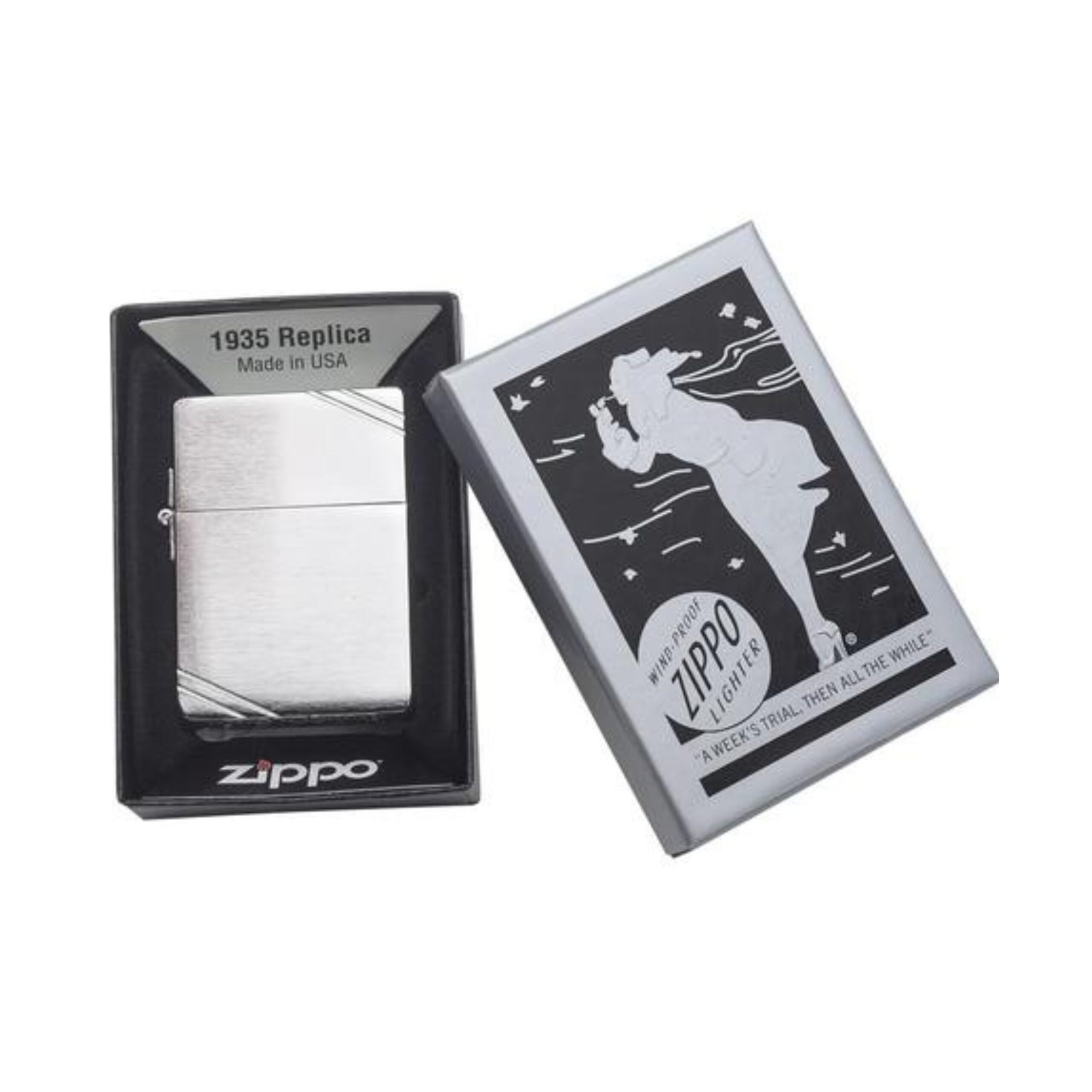 Ritorno alle origini Zippo. La 1935 Replica in Brushed Chrome ripropone i dettagli dell’epoca: cerniera esterna a tre cilindri che unisce il coperchio, base piatta e timbro ZIPPO dedicato sul fondo. La finitura spazzolata esalta il carattere vintage preservando la robustezza del corpo in metallo.