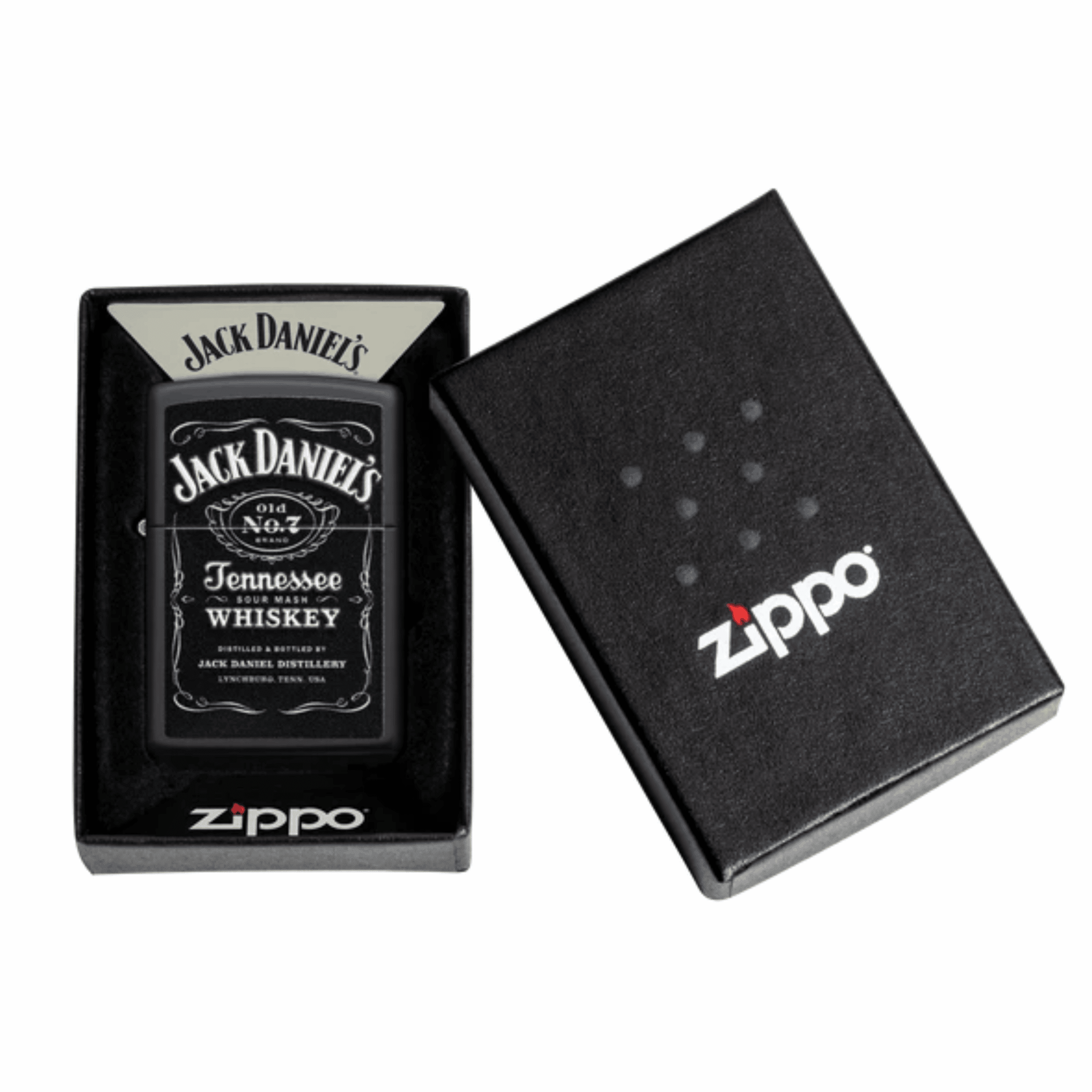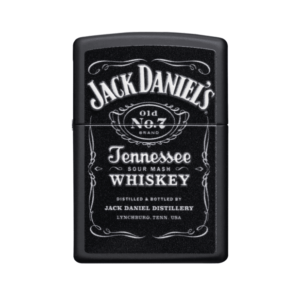 Zippo Jack Daniel’s® – Black Matte. Artwork Old No. 7 su fondo nero opaco, Texture Print 3D a lunga durata. Antivento, ricaricabile, “click” iconico, Made in USA. Gift box ufficiale.