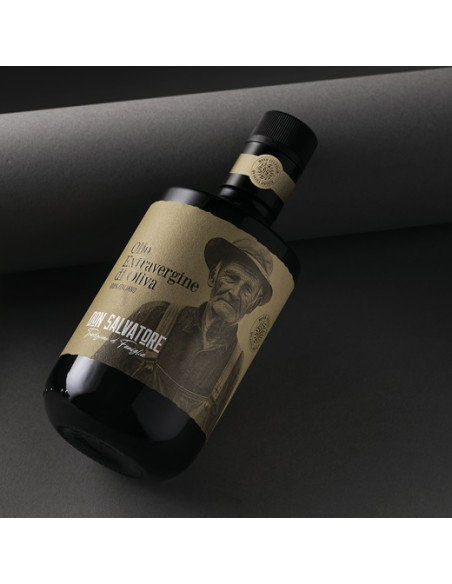 L'olio extravergine Don Salvatore racchiude il calore delle tradizioni e l'eccellenza della cultura gastronomica italiana, è un olio 100% italiano prodotto esclusivamente da olive mono cultivar di qualità Ortice, raccolte a mano, senza uso di pesticidi e concimi chimici e vengono coltivate con dedizione nelle colline di Morcone e la molitura è a freddo.