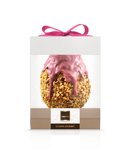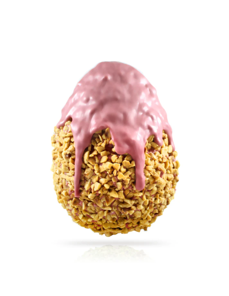 Quest'uovo di Pasqua di Shockino Mix Experience è realizzato in cioccolato ruby, ricoperto di granella di nocciole del Piemonte.